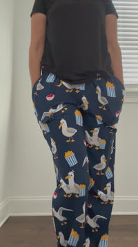 These lounge pants feature a playful and quirky seagull print, making them a standout choice for comfort and fun. Designed with a unisex fit, they are perfect for everyone. They include a drawstring closure for an adjustable fit and handy pockets to keep your essentials close. Made from a blend of 90% polyester and 10% spandex, these pants are soft, stretchy, and ideal for lounging or casual outings. Whether you're relaxing at home or enjoying a laid-back day, these lounge pants combine style and practicality seamlessly! Pair it with one of our great seagull tees!